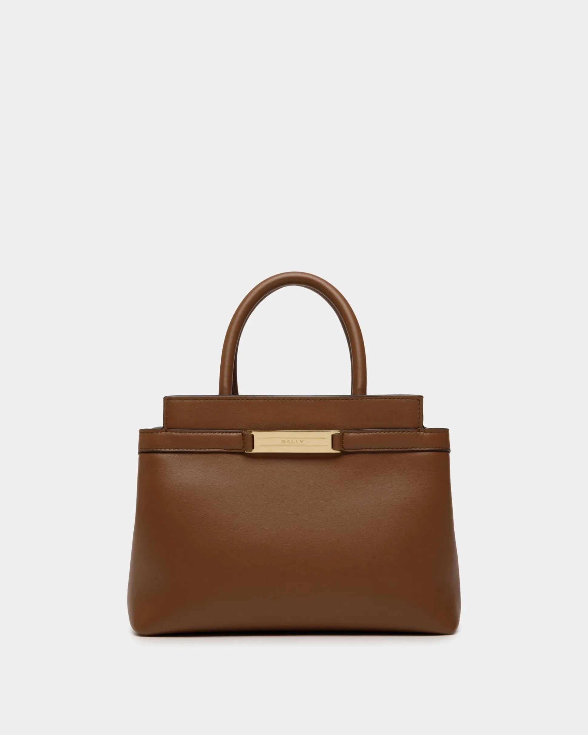 This small Deco tote bag in supple brown calfskin is trimmed by a metal plaque, a simple signifier that recalls the Bally Ribbon. Top handles and a removable shoulder strap offer multiple carry options.
