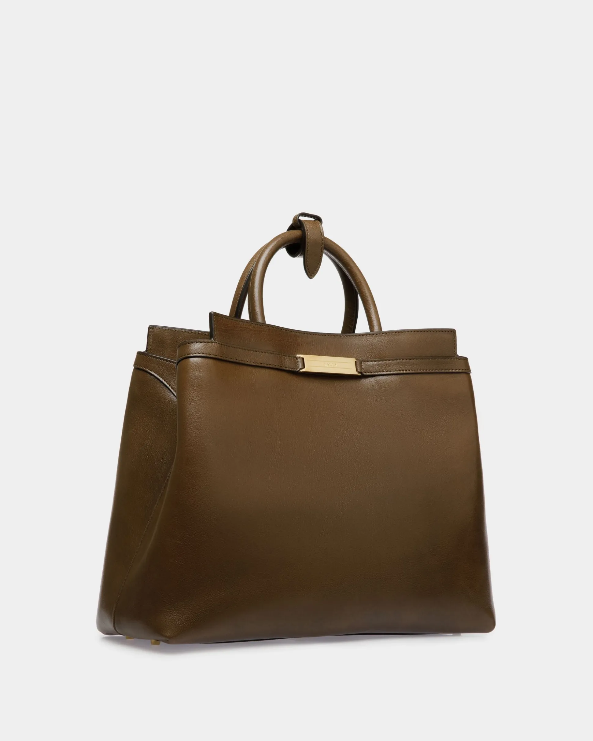 This Deco tote brings the timeless elegance of craquelure buffalo leather and a trapeze silhouette to an everyday essential. The front is trimmed by a metal plaque, a simple signifier that recalls the Bally Ribbon, engraved with a logo. Top handles and a removable shoulder strap offer multiple carry options.