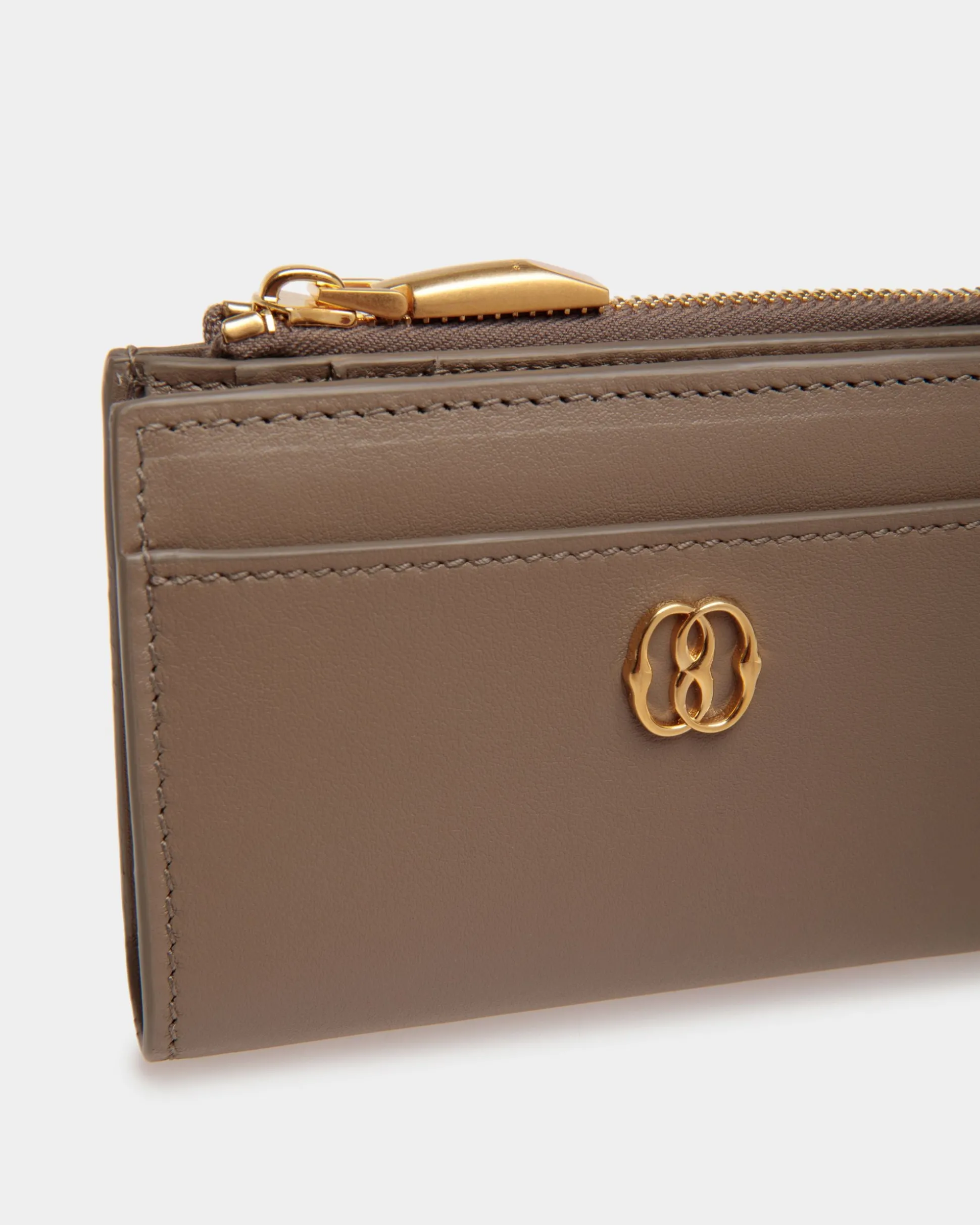 Elevate your style with our Emblem wallet in a rich taupe hue. Made from luxurious calfskin, this chic accessory boasts multiple slots for cards and IDs, a secure zipped compartment for coins, and a quick snap closure.