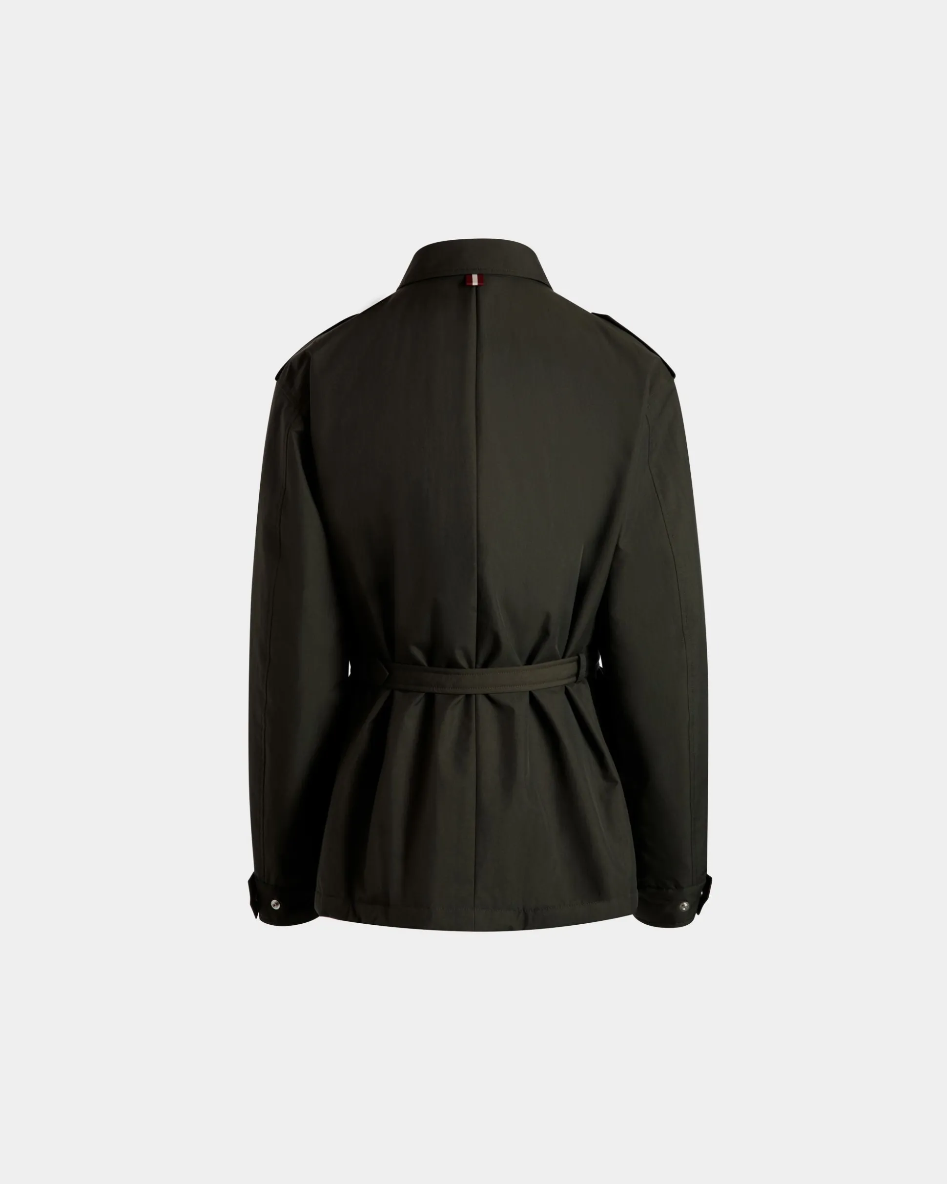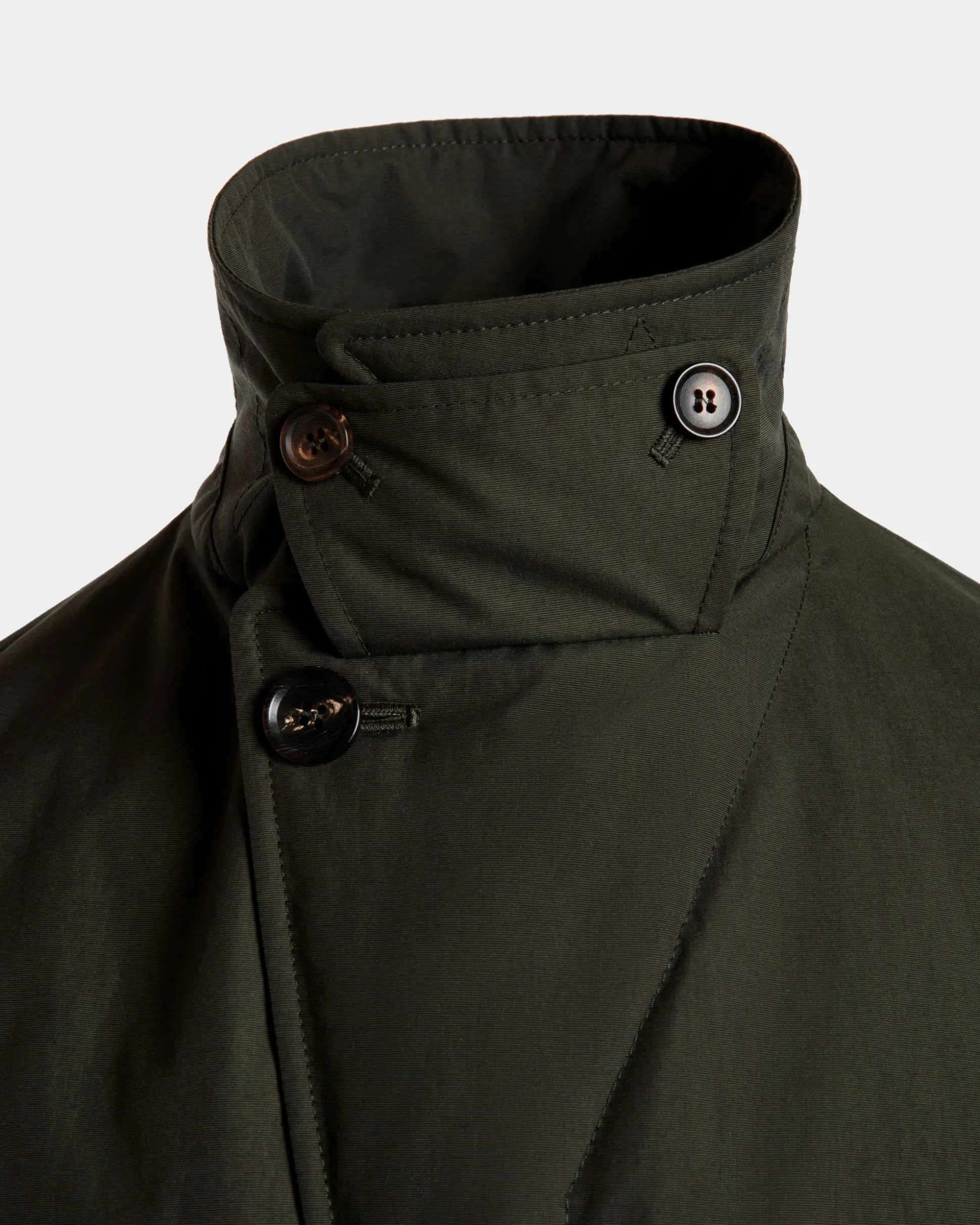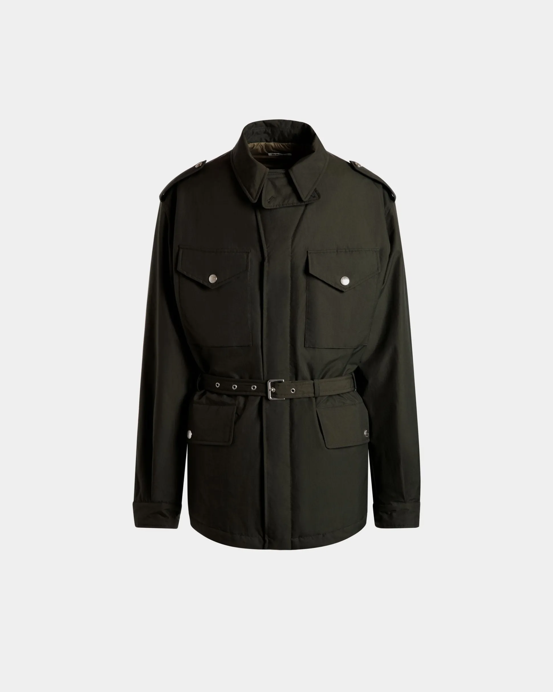 This belted field jacket in military green nylon reveals its utilitarian inspiration through multiple flap pockets, epaulettes and a flap covering on the high neck, protecting from the elements.