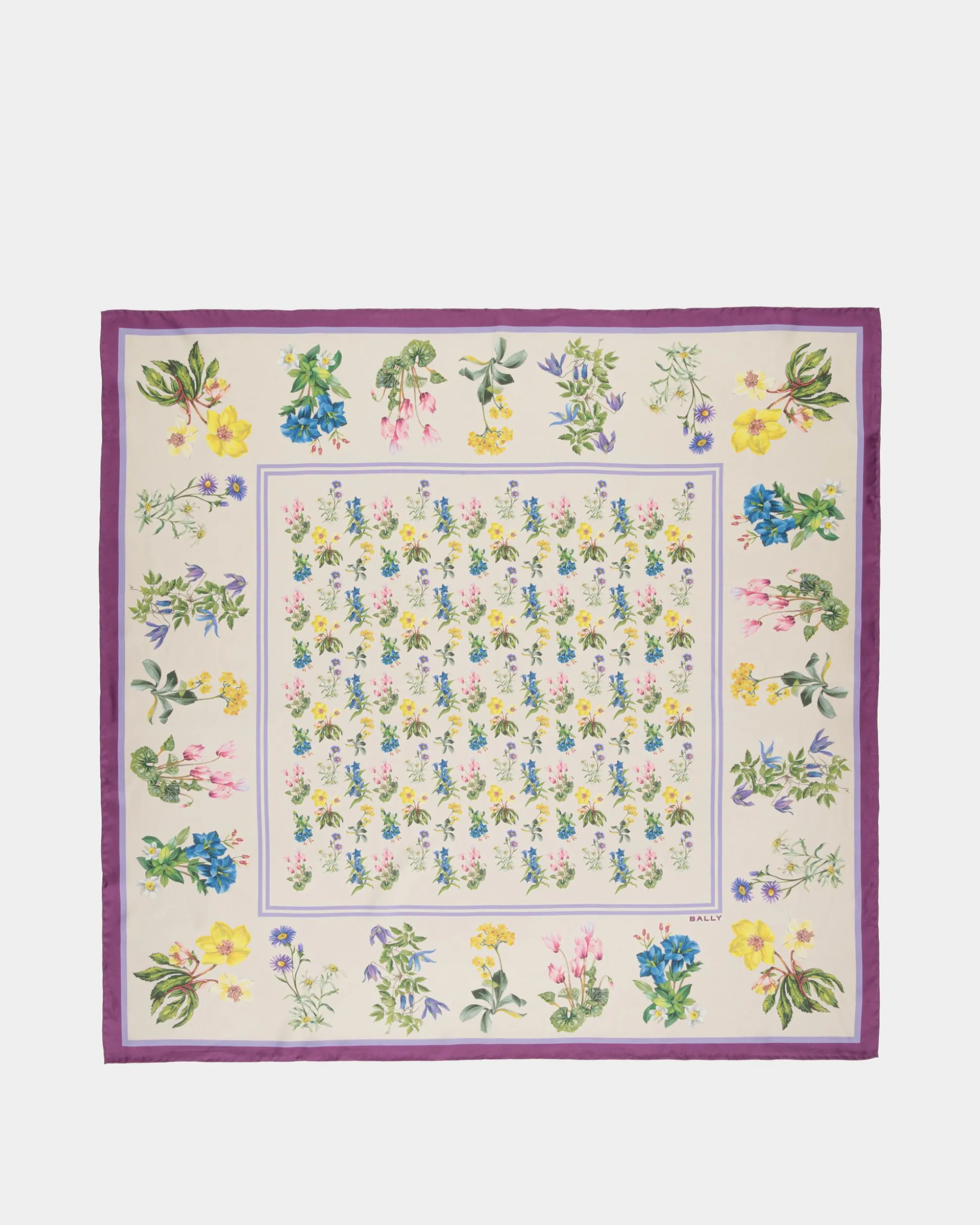 Inspired by a vintage book of Swiss blooms, the Mountain Flower print brings the beauty of Alpine landscapes to this silk scarf.