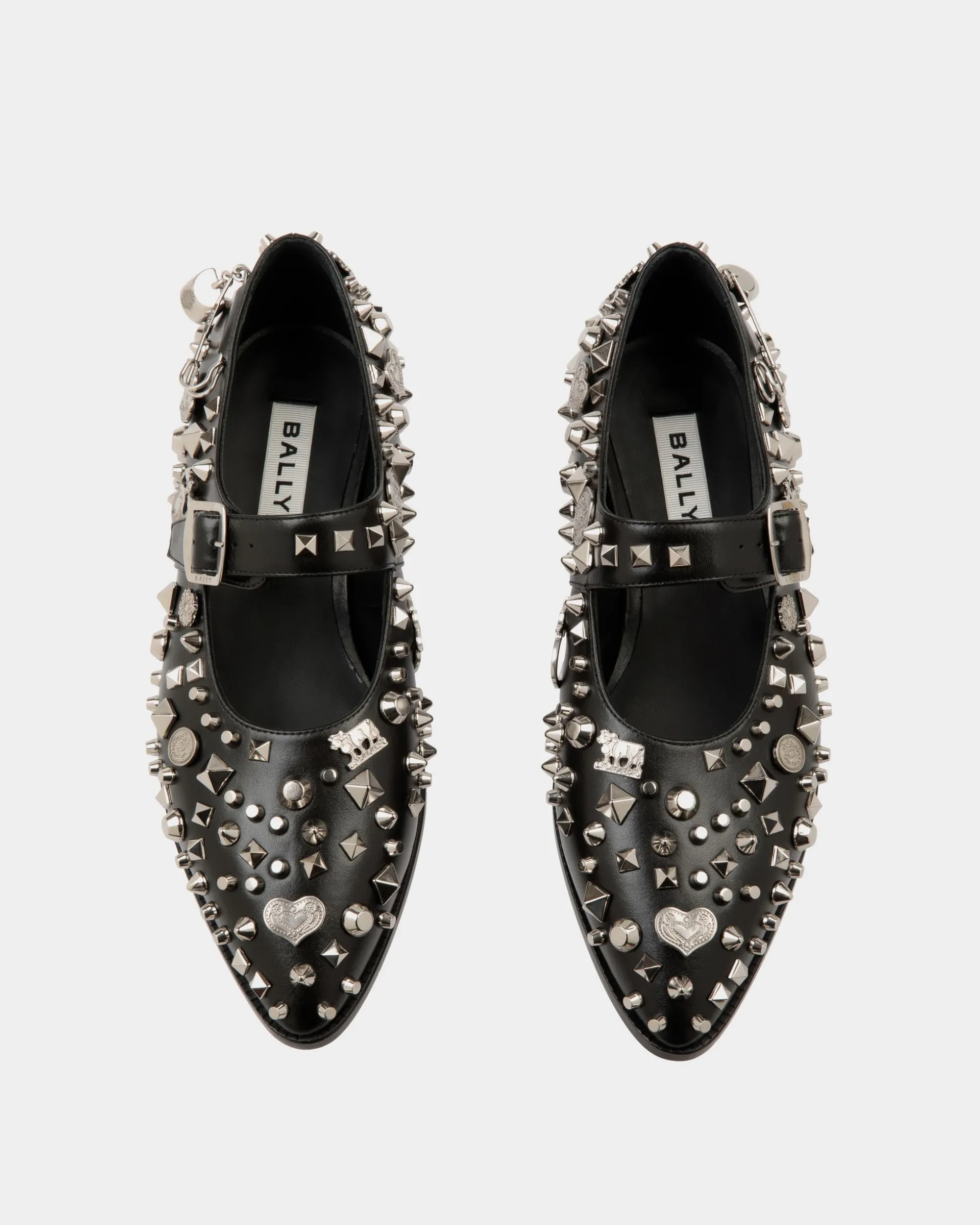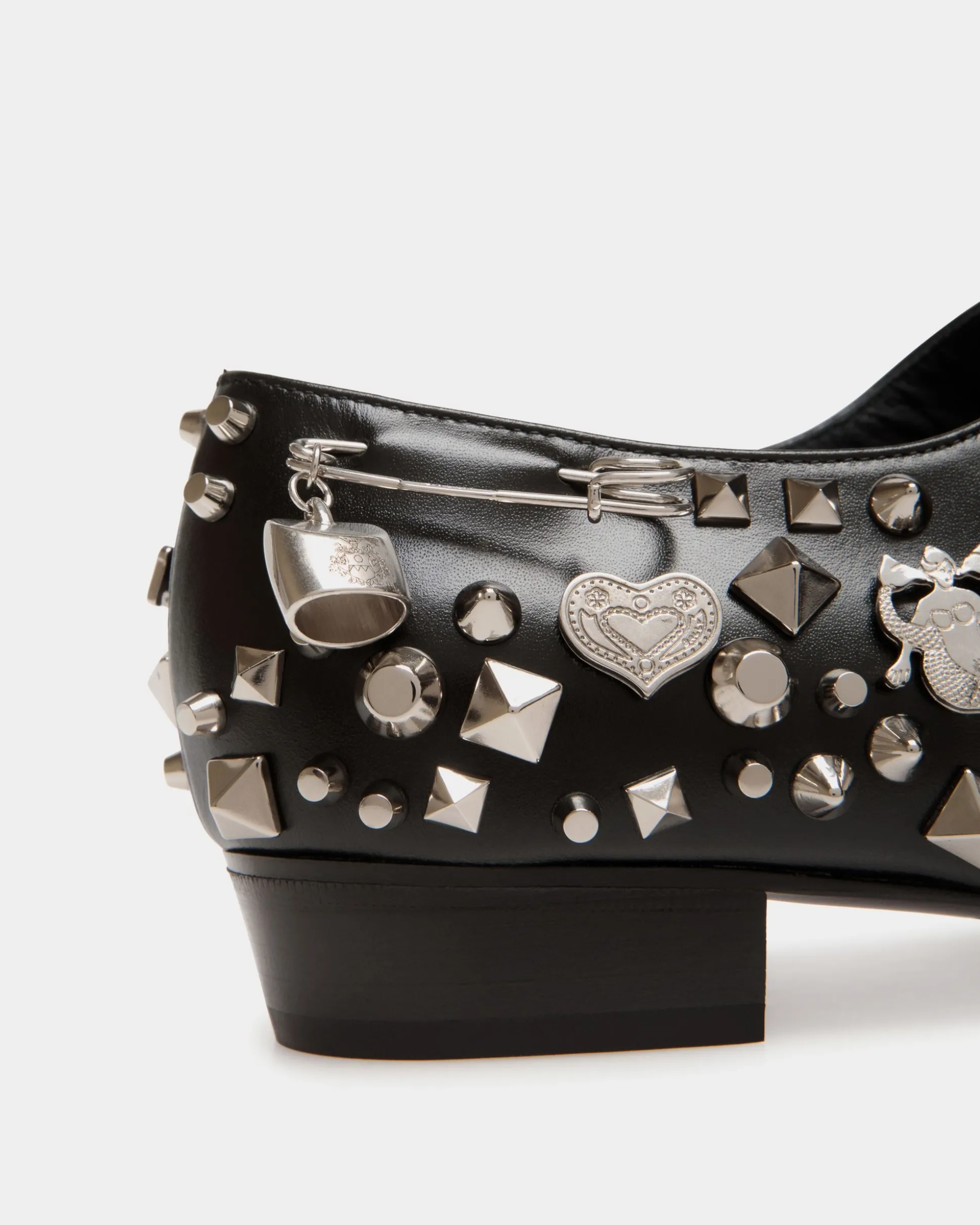 A statement shoe seen in the Bally FW24 fashion show, this Glendale Mary-Jane is a bold reinterpretation of an archival style. Unexpected and iconic metal details and a safety pin with a cowbell add extra attitude to the black leather upper.