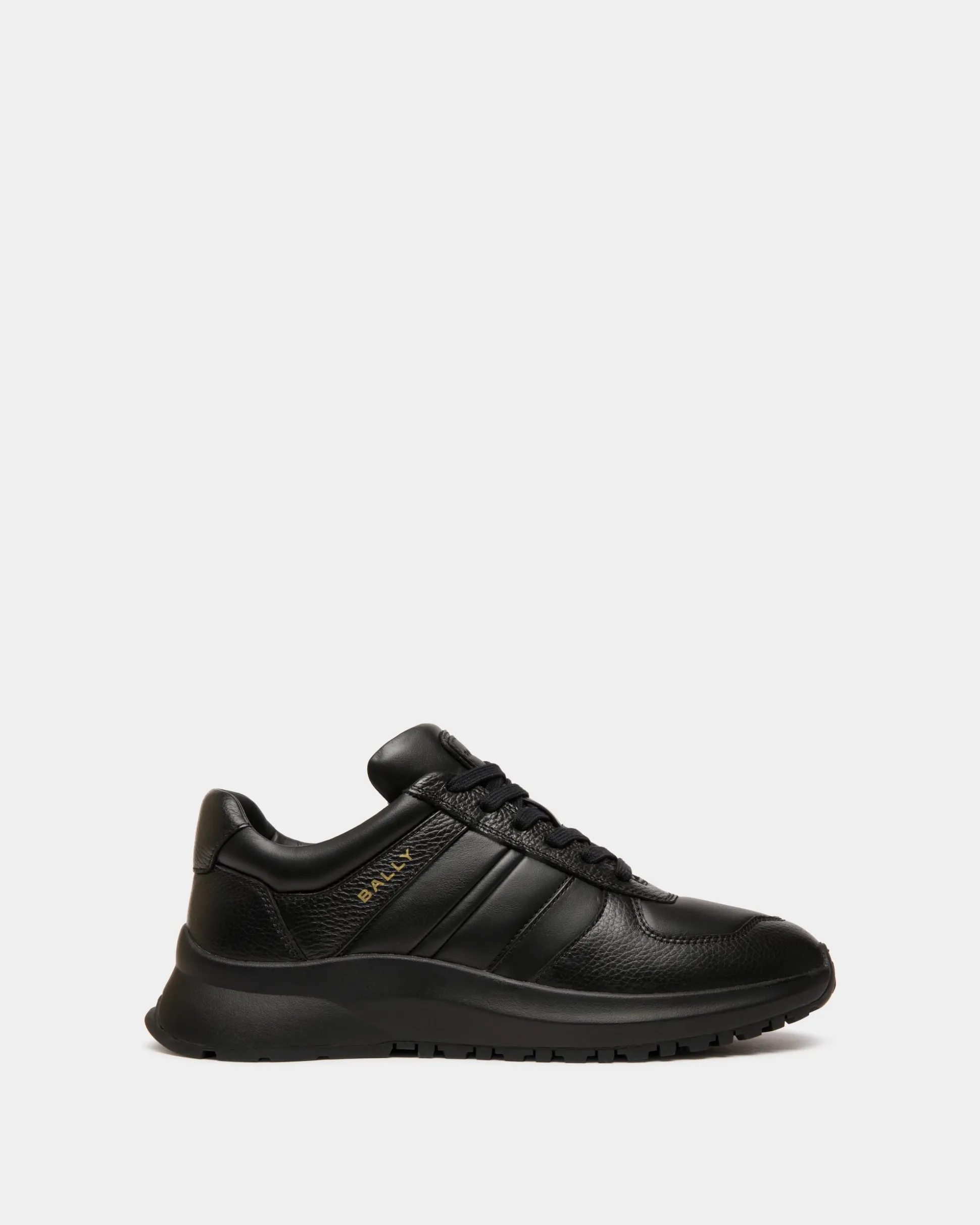 In grained and smooth black leather, this Outline sneaker has a chunky yet lightweight Vibram running sole for all-terrain grip. A gold-foil Bally logo trims the monochromatic Ribbon motif at the side.