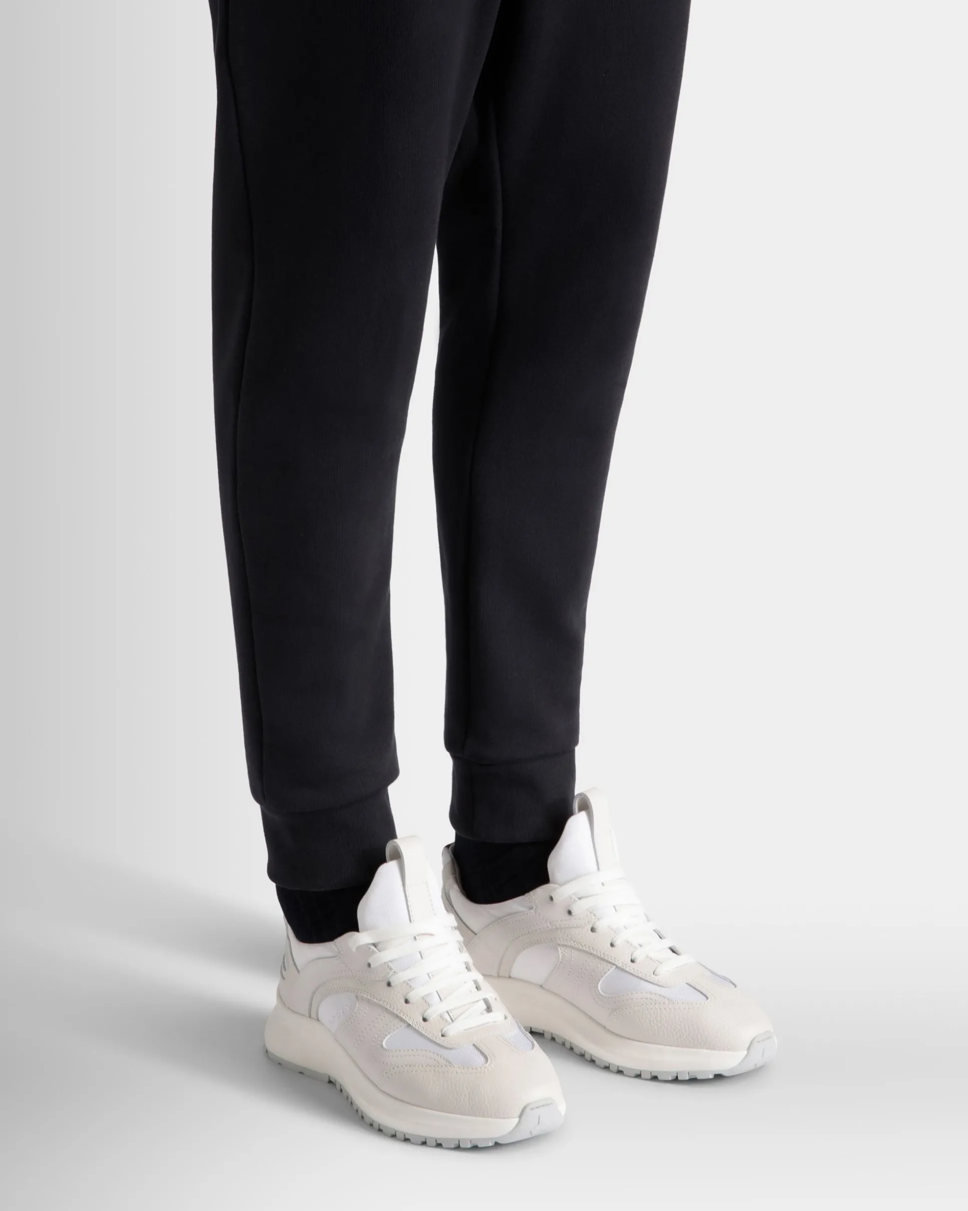 This Outline sneaker combines white leather and nylon. The thick rubber sole interprets classic running looks, complete with Bally grip tread on the Vibram outsole.