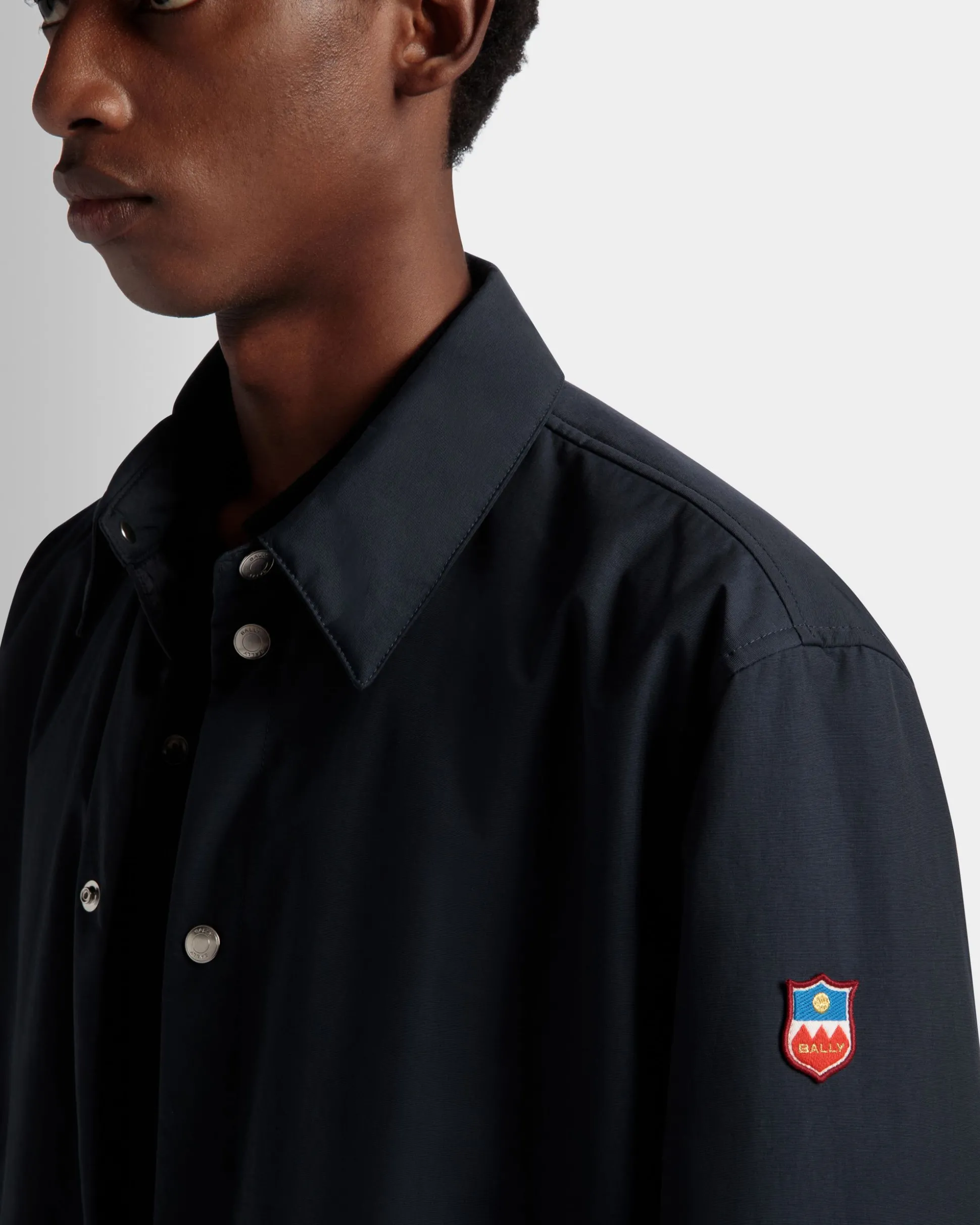 In navy blue nylon fabric, this padded shirt jacket has a snap button fastening down the front for varied styling options. Two ample patch pockets keep essentials on hand. Matching snaps adjust the fit of the cuffs.