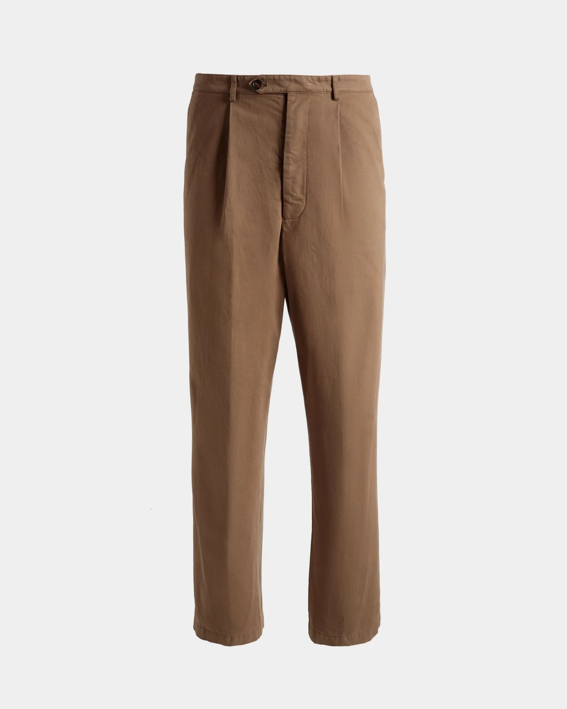 Cotton pants in a camel hue, designed for everyday wearability. The darts at the front and trouser tab fastening with a horn button hint at their tailored spirit while the twill material ensures versatility. Horn buttons also secure the full-welt back pockets.