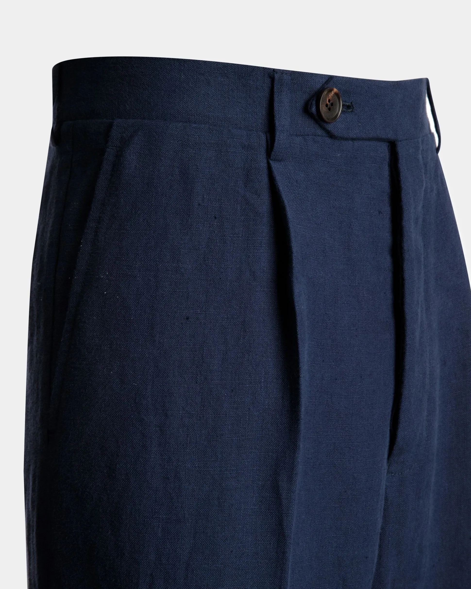Impeccably crafted navy blue linen pants with a central crease, belt loops and a straight leg. The rich color and lightweight premium fabric are elegant, while the classic design ensures versatility and timeless appeal.