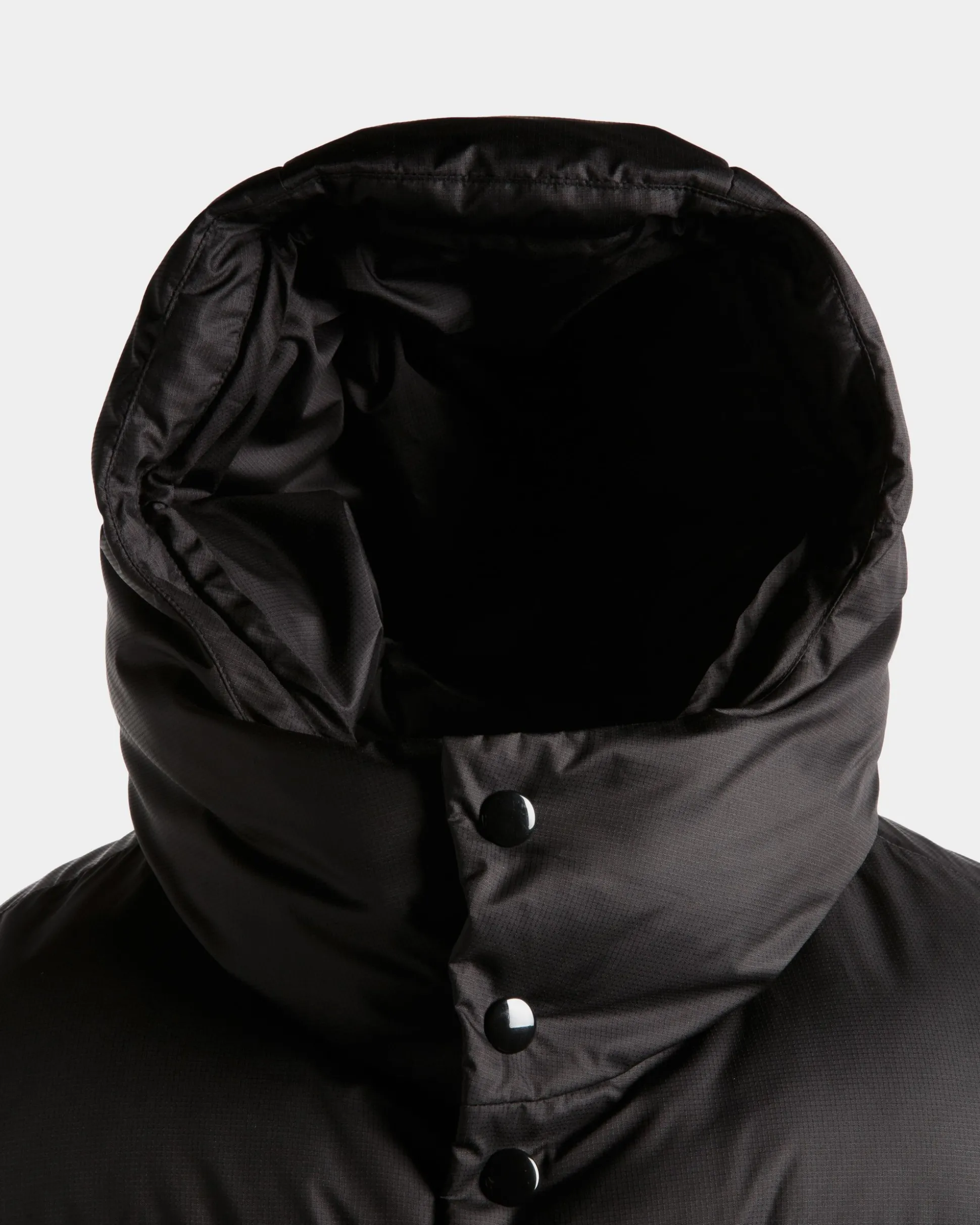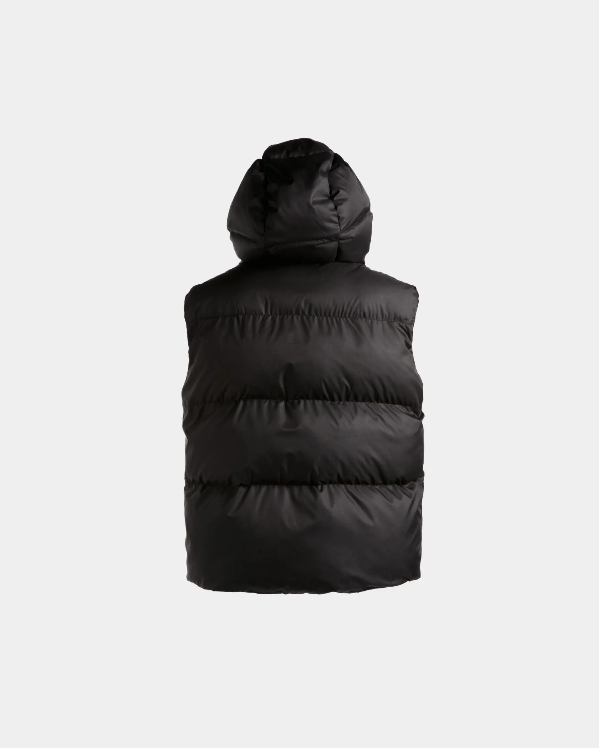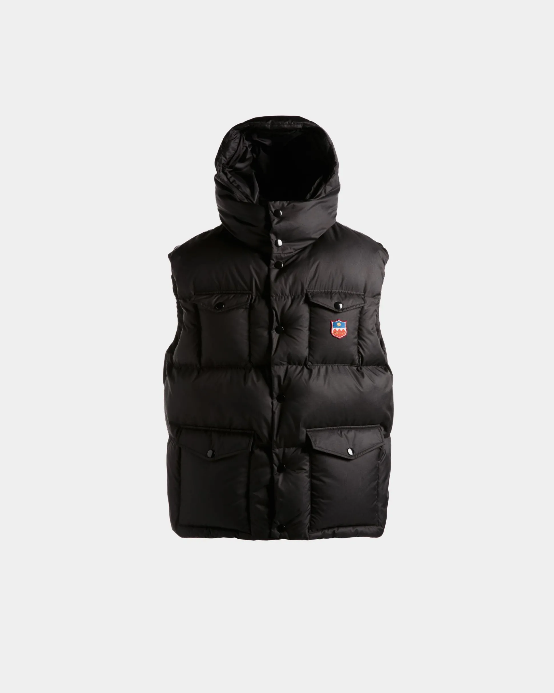 This hooded puffer vest with horizontal quilting is crafted with precision in water-repellent ripstop nylon. The front is completed by four patch pockets closed by snaps and a Bally Crest patch on the chest.