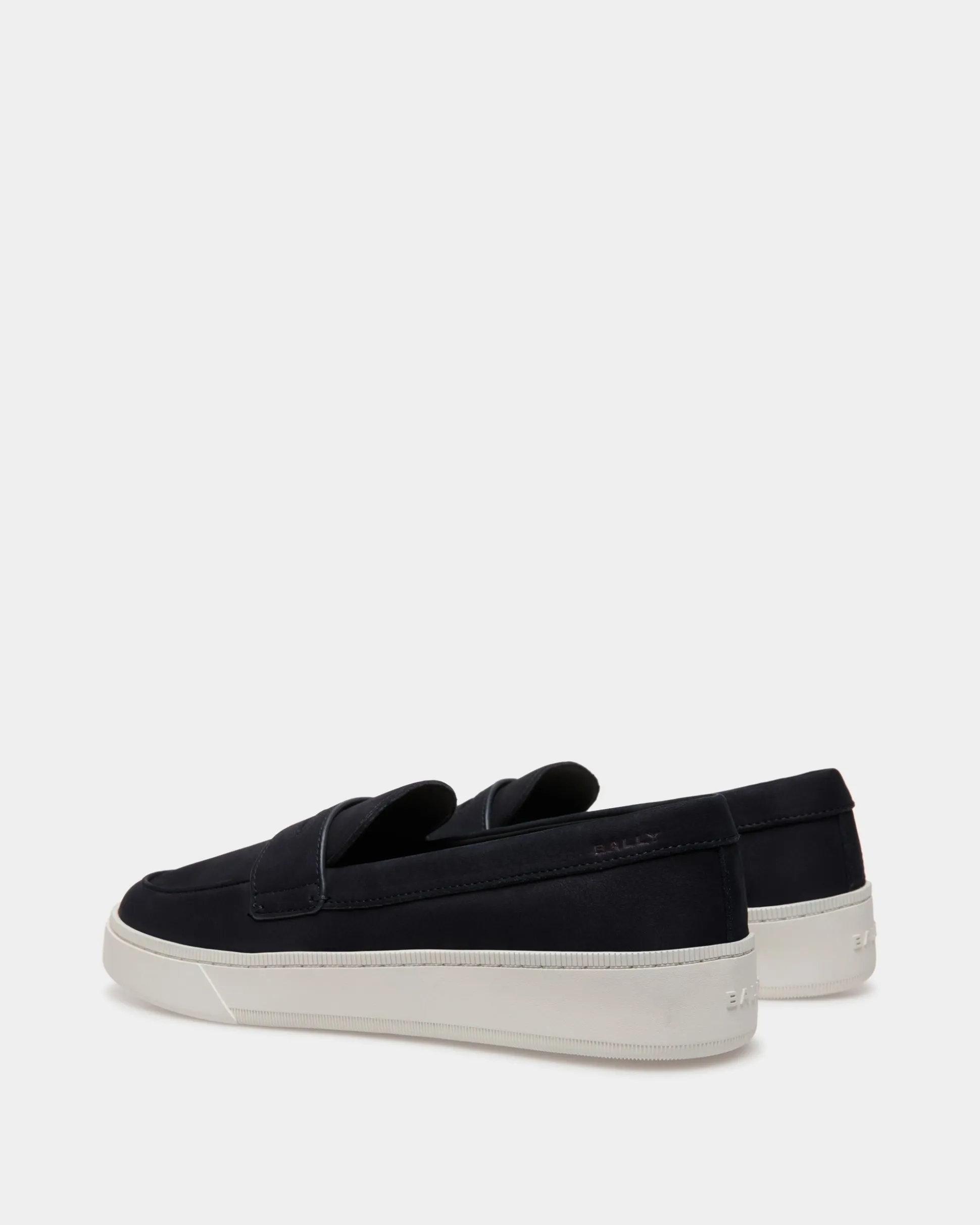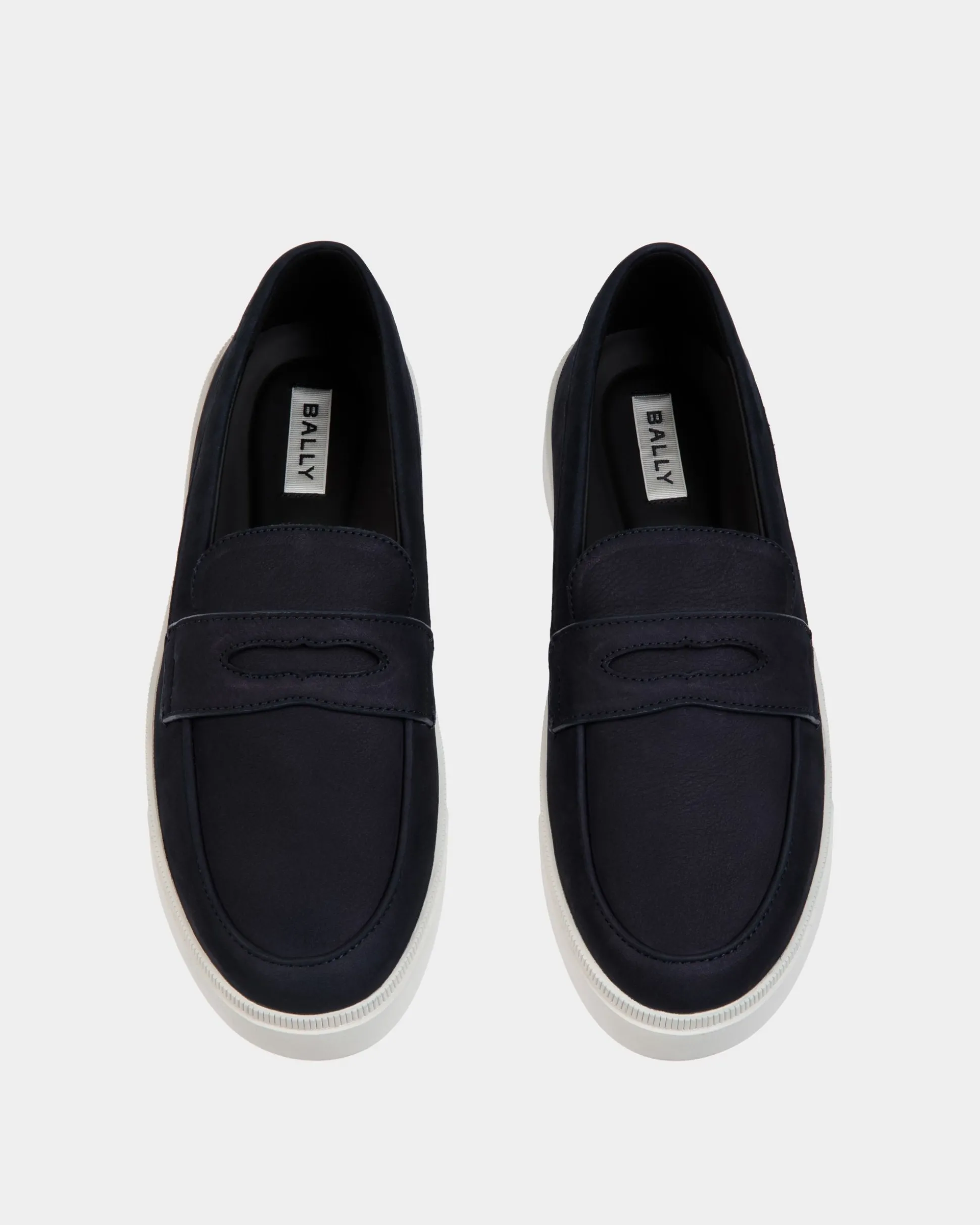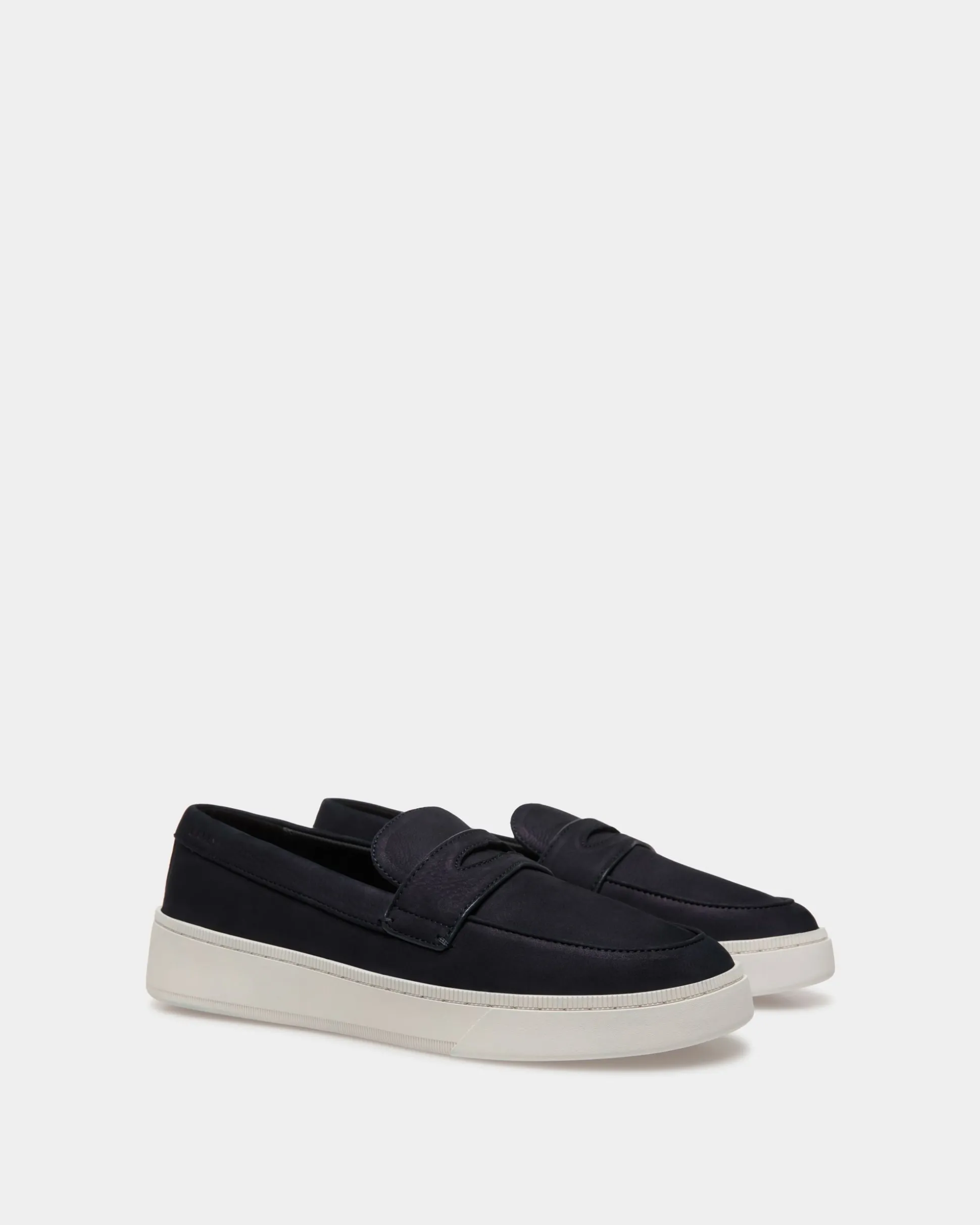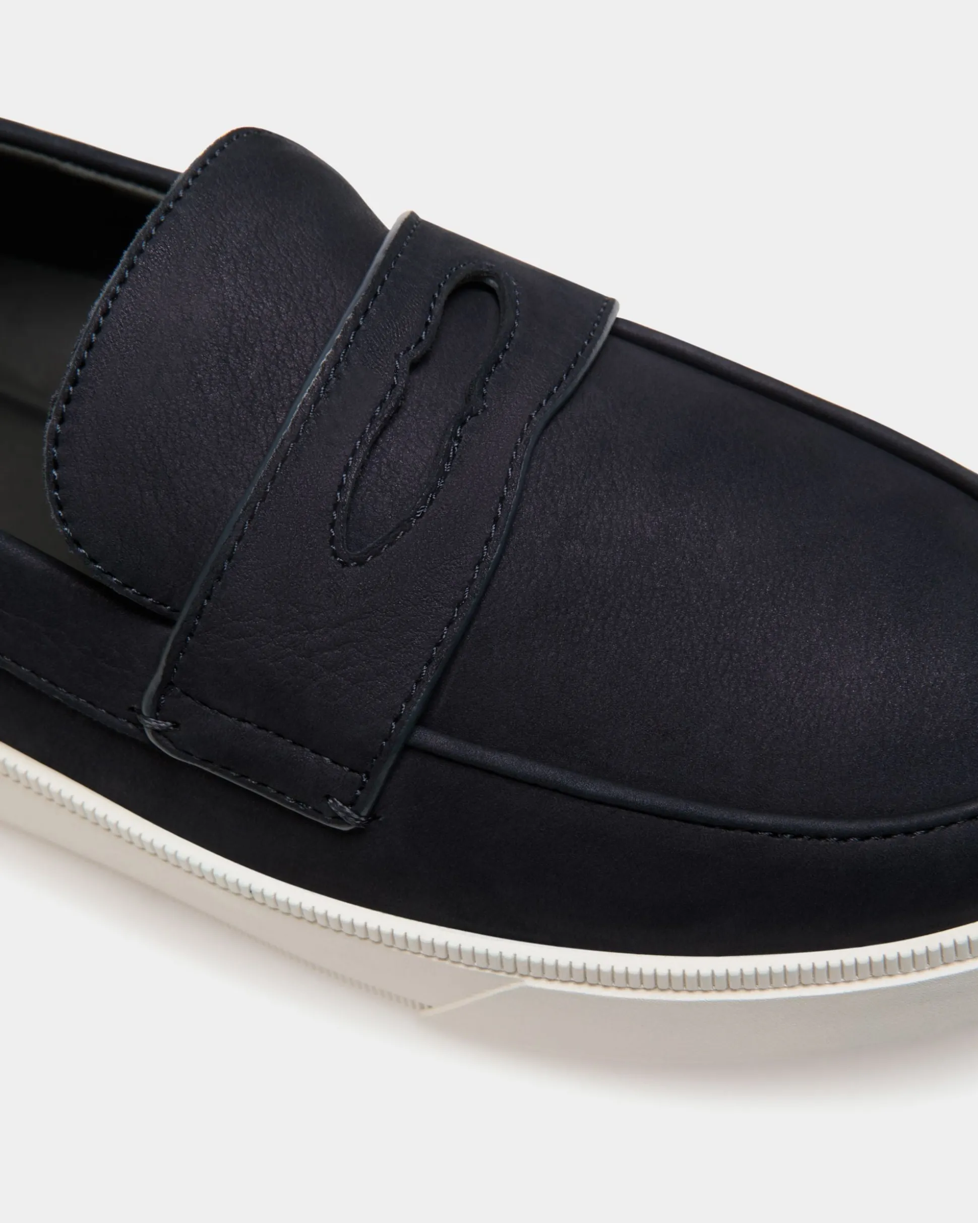 This Raise sneaker combines a navy blue nubuck upper with a thick rubber sole for a contemporary interpretation of a classic loafer. Its slip-on design is complemented by a Zahogel footbed for absolute comfort.
