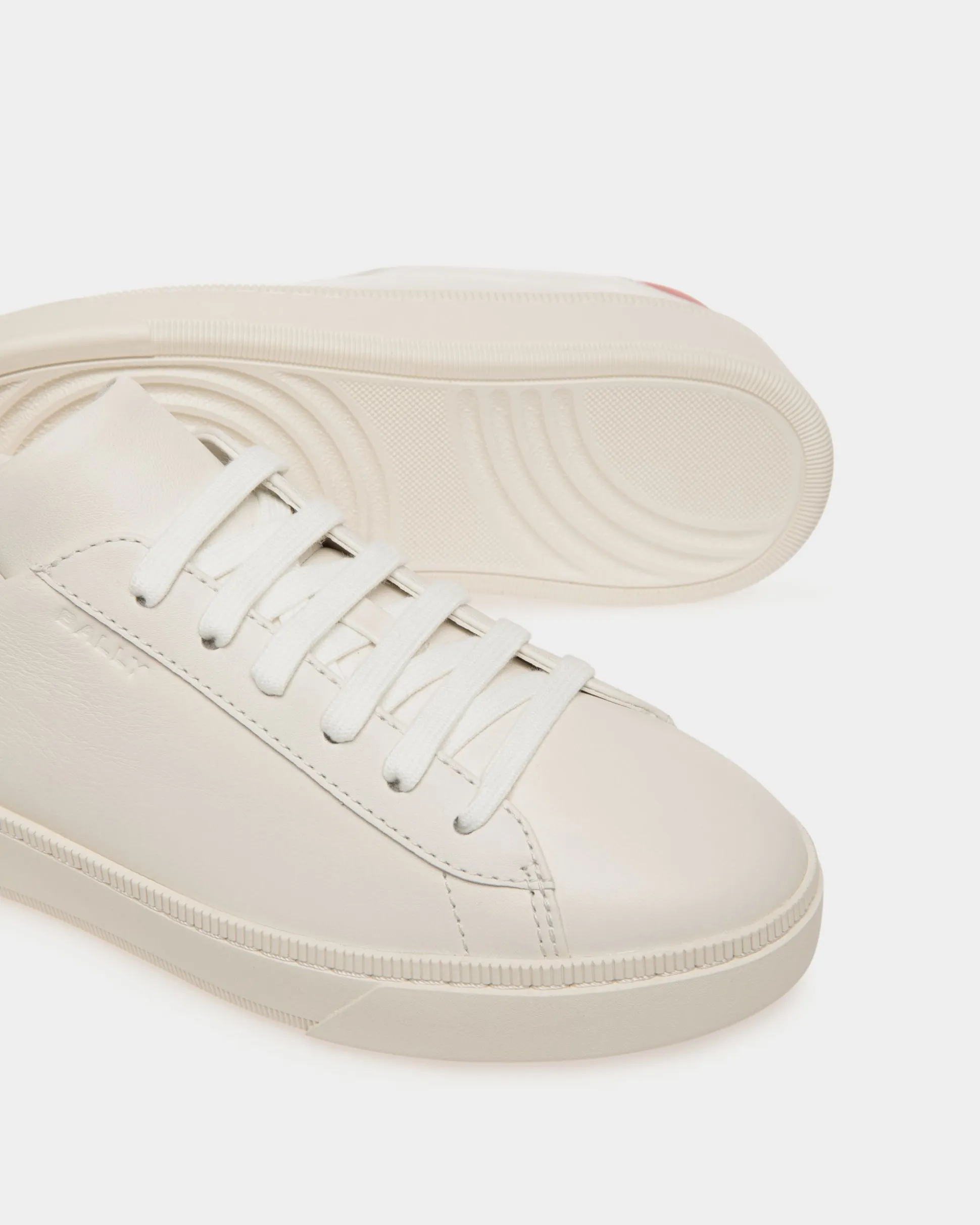 The calfskin upper of this white Raise sneaker is united with a raised rubber sole. The red heel tab adds an iconic pop of color.