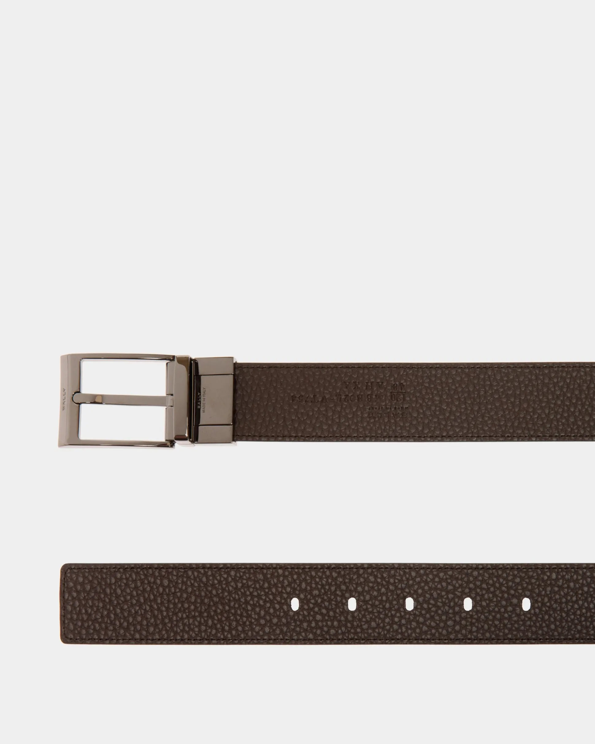 Adjustable and reversible, the Shiffie 35mm belt offers a choice of ebony or black leather. The rectangular buckle at the front, in polished ruthenium-tone metal, is embellished by an essential debossed Bally logo.