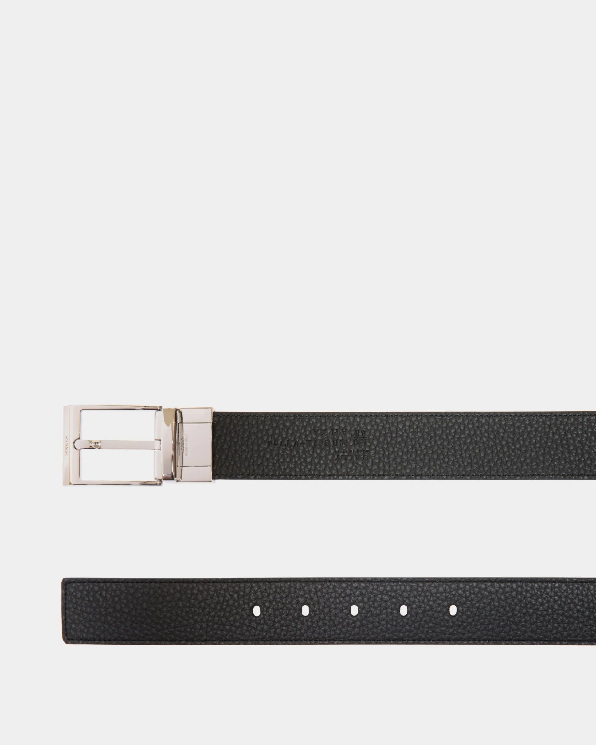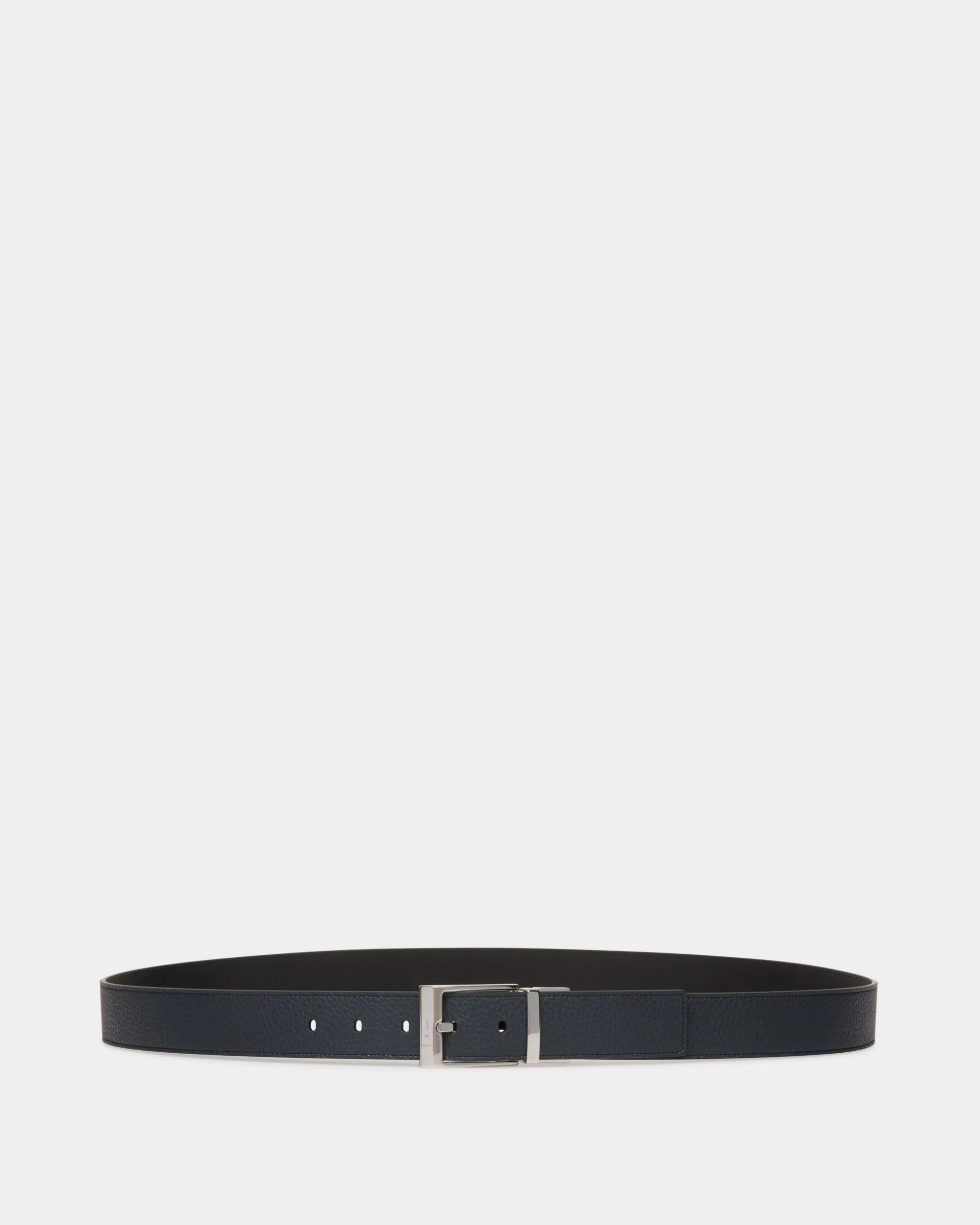 Adjustable and reversible, the Shiffie 35mm belt offers a choice of navy blue or black leather. The rectangular buckle at the front, in polished silver-tone metal, is embellished by an essential debossed Bally logo.