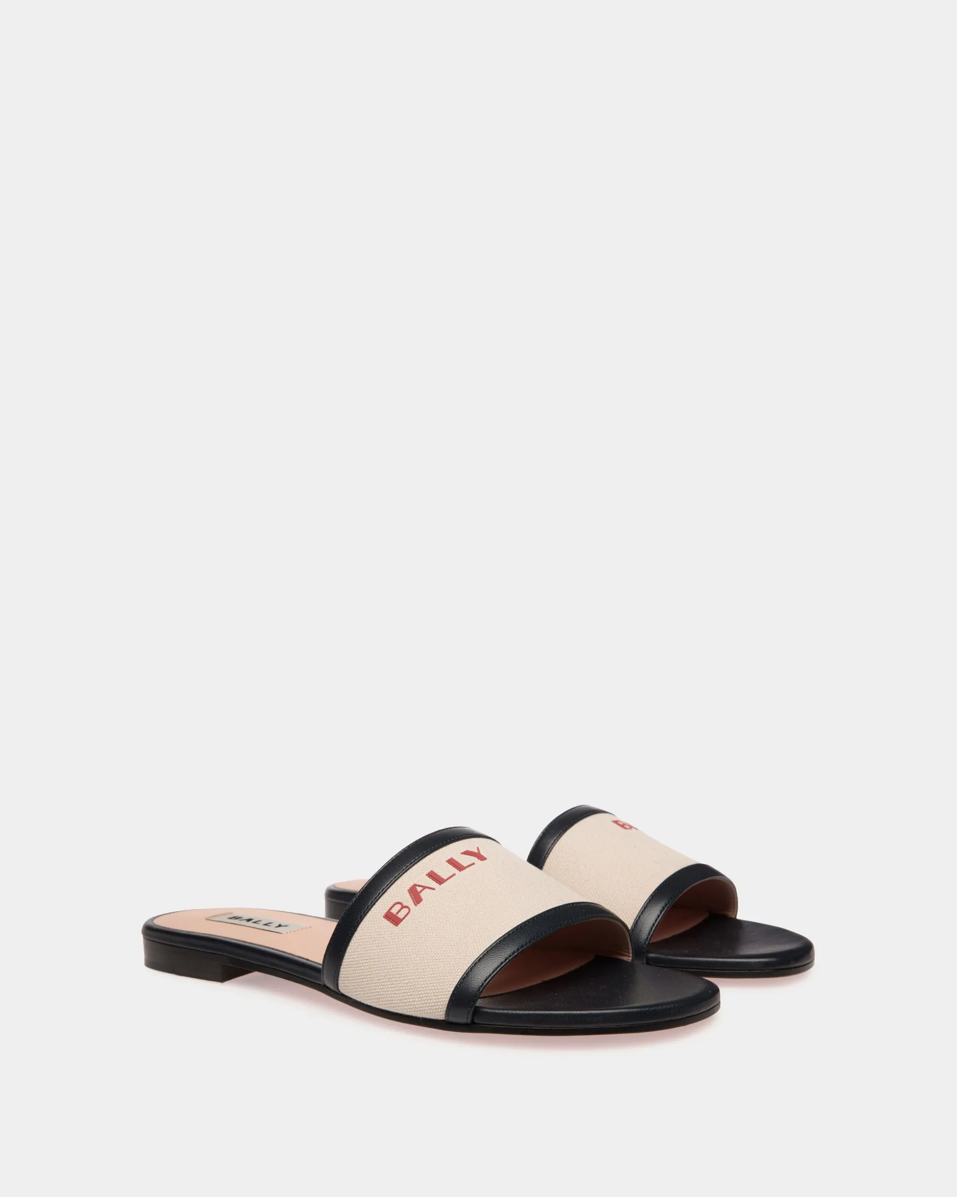 Distinguished summery character fuses with Art Deco style in these canvas slides, trimmed in lambskin. The upper rests on a leather sole and comfortable monoblock heel.