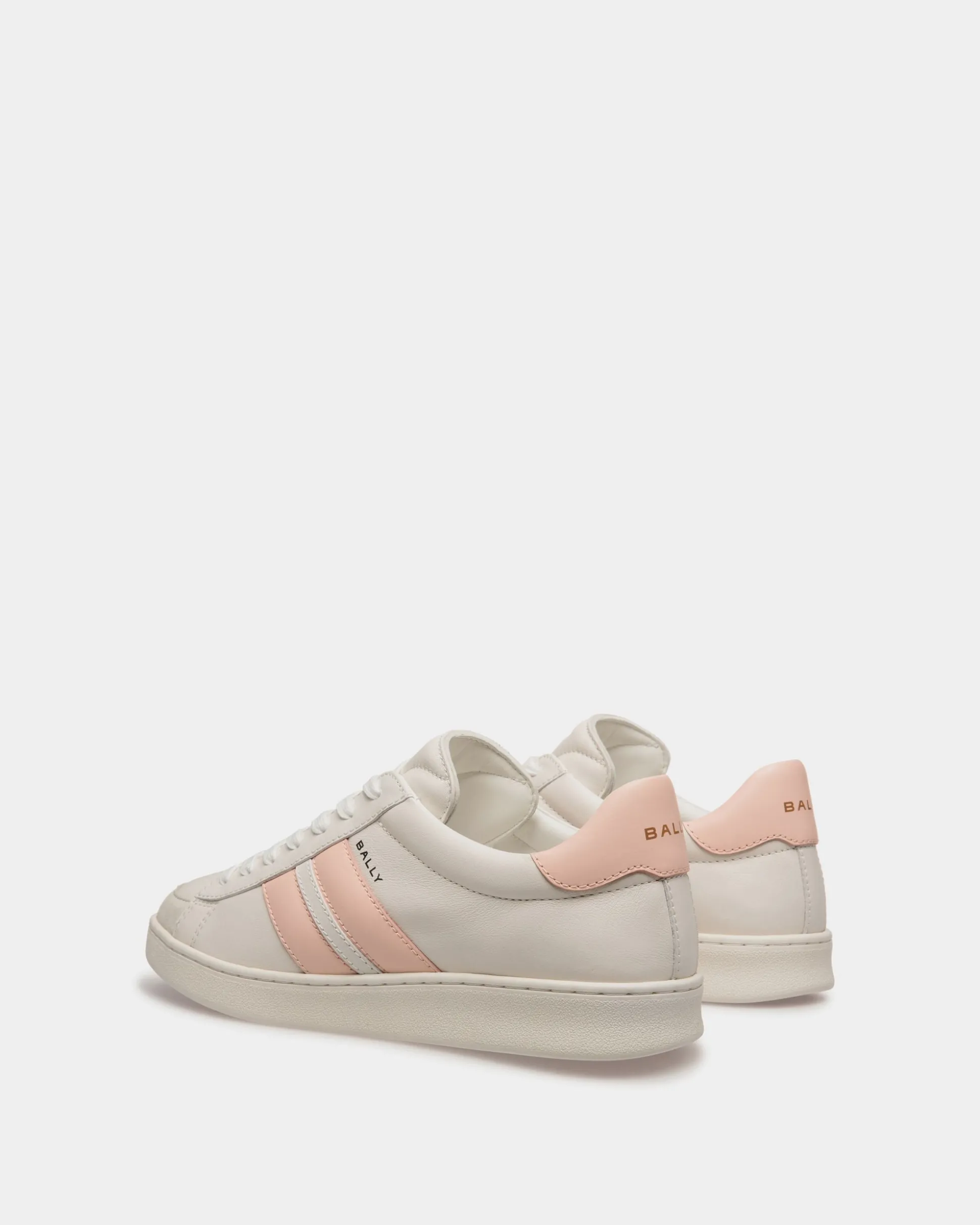 In crisp white and Baby Pink leather, the Tennis sneaker is trimmed by an essential Bally Ribbon. A reinforcement on the toe adds to its durability. The rubber sole is comfortable while providing grip.