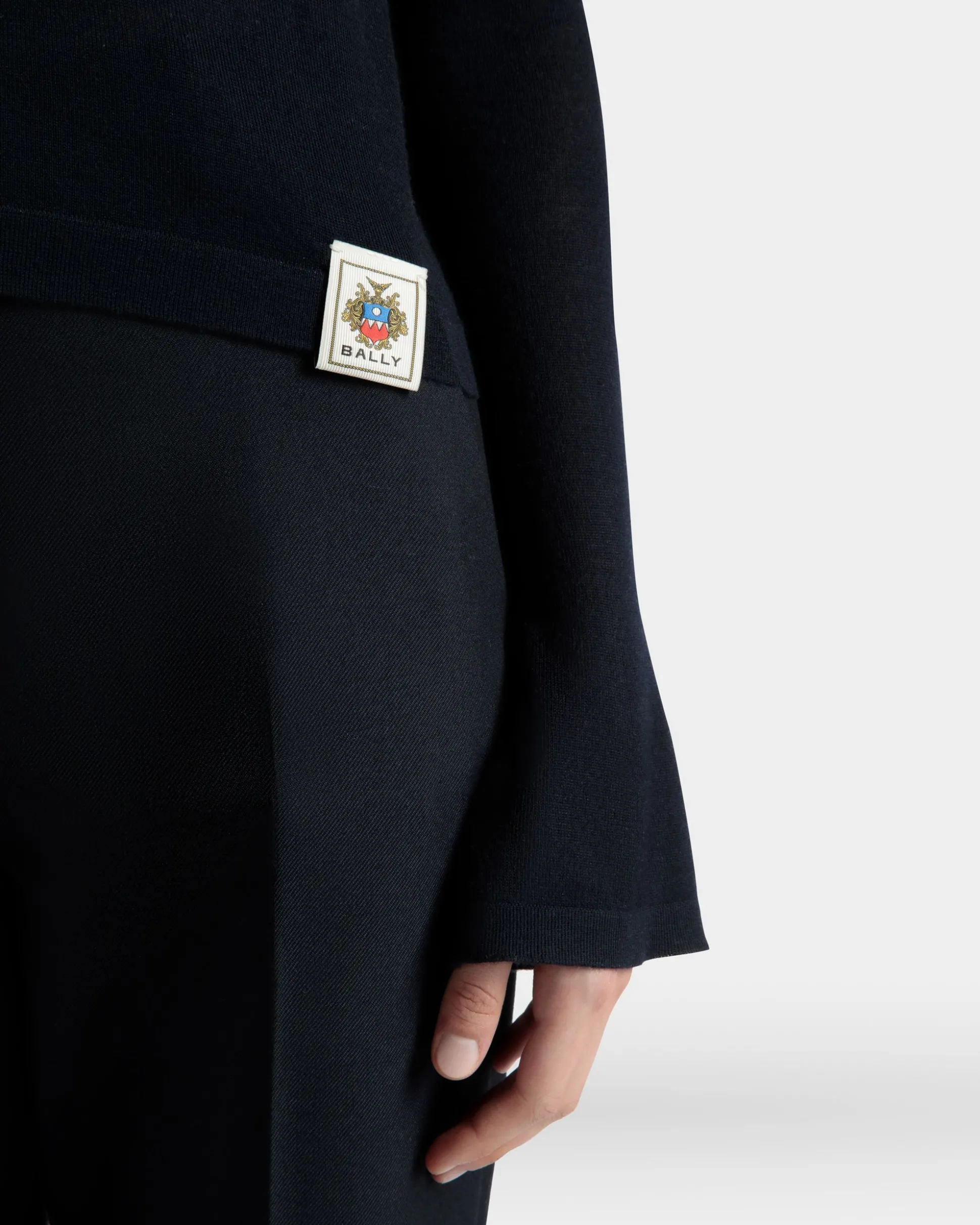 This V-neck knit top is crafted from sumptuously soft navy blue cashmere. The rounded V neckline creates a contemporary aesthetic, while the cuffs flare slightly as they sculpt the silhouette.